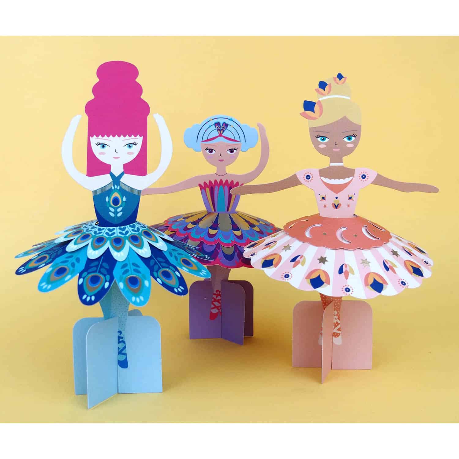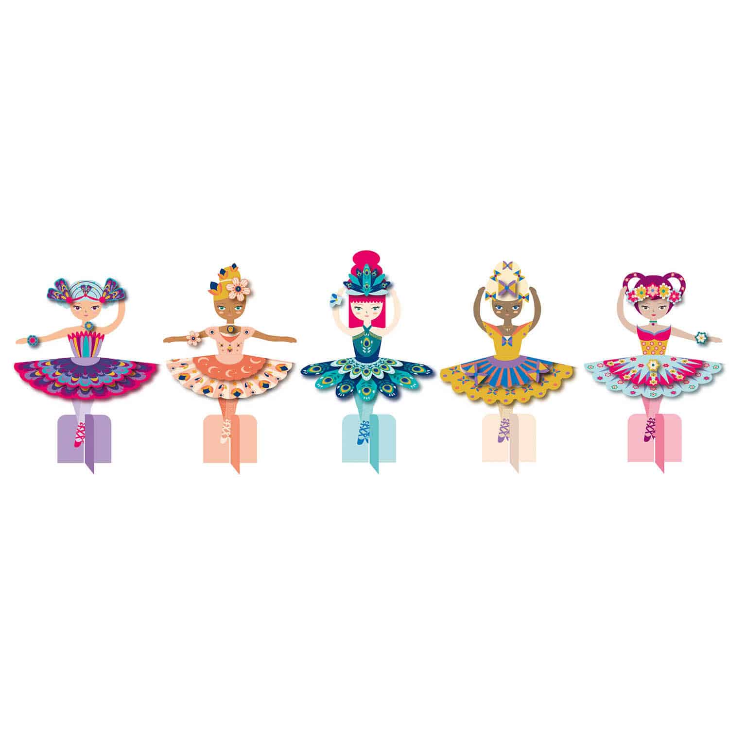 Skab 5 smukke ballerinaer af disse kunstneriske papirark, ved at påsætte de medfølgende dekorationer.