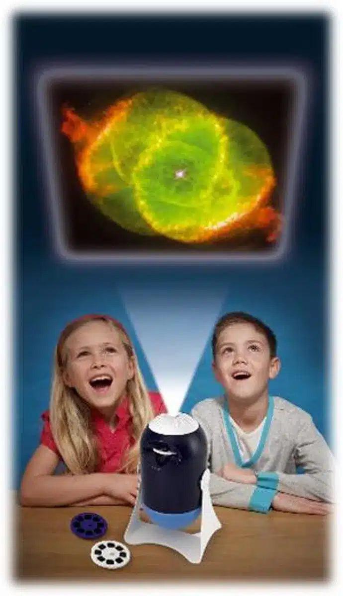 Forvandl dit mørke rum til et lysshow fra det ydre rum, og udforsk universet med Deep Space Home Planetarium og projektor. Dette bord-planetarium og -projektor har eget stativ, og hoveddelen af enheden roterer, så du kan bruge enten projektoren eller planetariet. Planetariet har to kupler, den ene projicerer stjernemønstre og den anden projicerer konstellationer på lofter og vægge. Placer kuplen til den sorte stjerne eller konstellation på sprækkerne oven på dybrumsenheden, drej forsigtigt for at holde kuplen på plads, tænd kontakten til kuppelprojektorindstillingen, og se billederne rotere rundt i dit værelse. Drej kuplerne ud for at frigøre dem. Tilføj natlyskuplen, og det dybe rum bliver et køligt natlys med roterende stjerner og stjernebilleder. Drej enheden rundt og brug højkvalitetsprojektoren til at se 24 NASA og Hubble Telescope-farvefotografier af rumfartøjer, astronauter, planeter og tåger fra tre udskiftelige diasskiver. Projicerer billeder op til en meter brede og bevarer stadig klarheden. Drej linsehovedet for at fokusere billederne på din væg eller loft, og drej diasdiskene for at ændre billedet. Lås op online med den hemmelige kode for at lære om nattehimlen og læse fascinerende information om hvert enkelt NASA-fotografi. Fra 8 år. Batterier (3xLR6-AA). ekskl