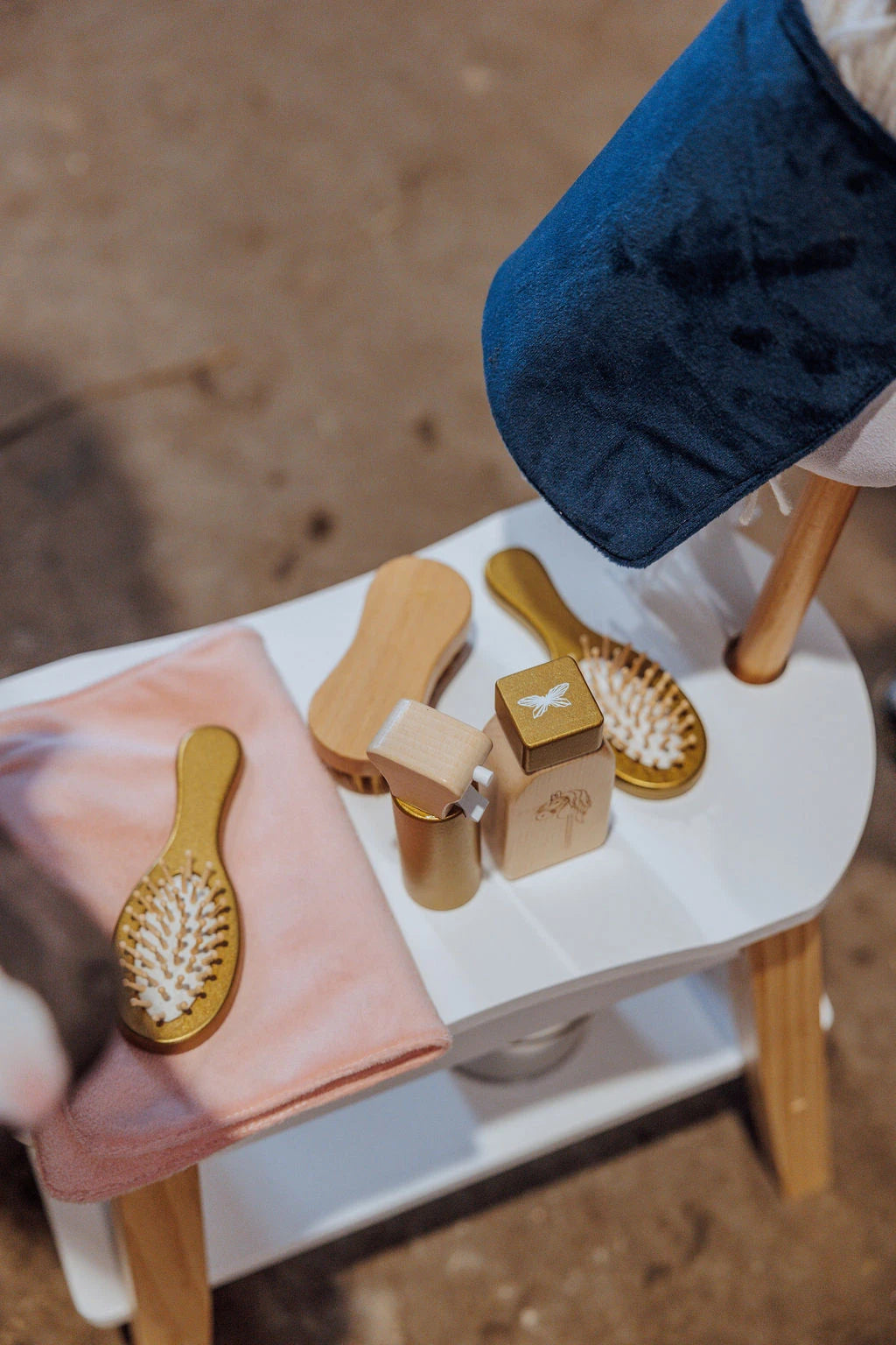 Marineblåt velour dækken og matchende hut – skabt til stilfuld og praktisk kæphesteleg.