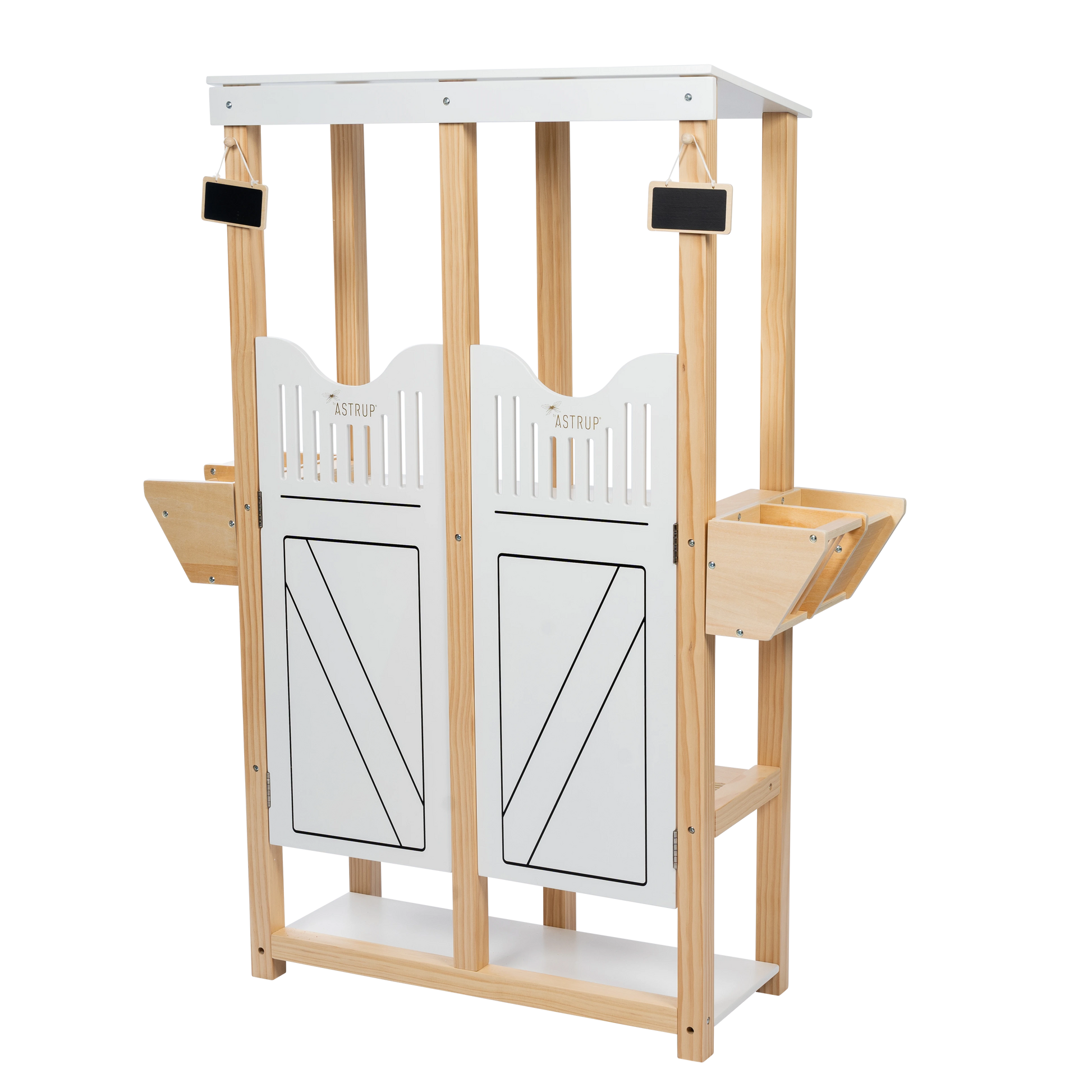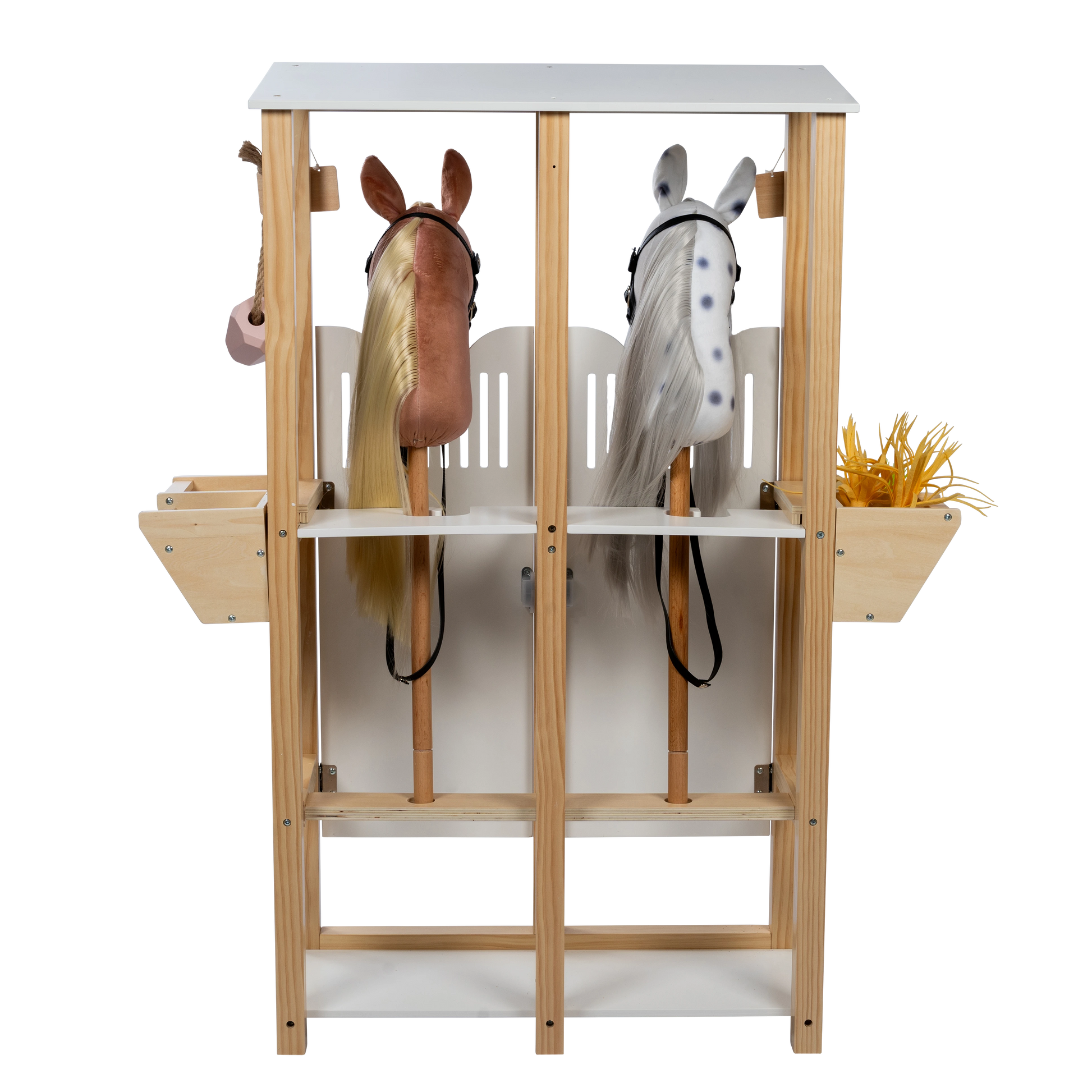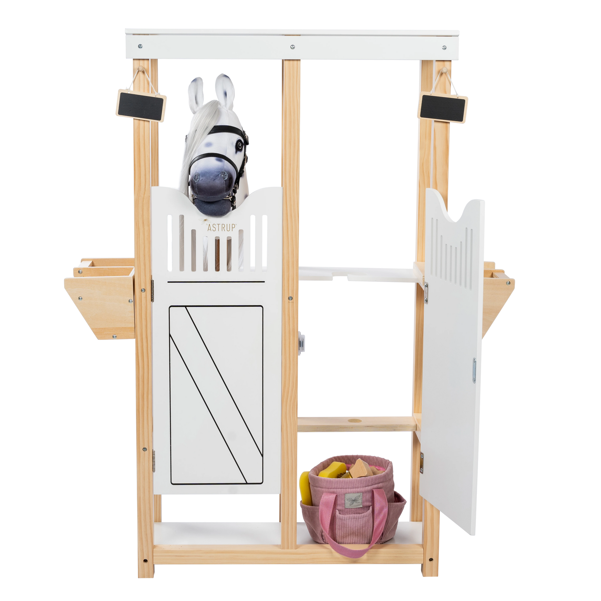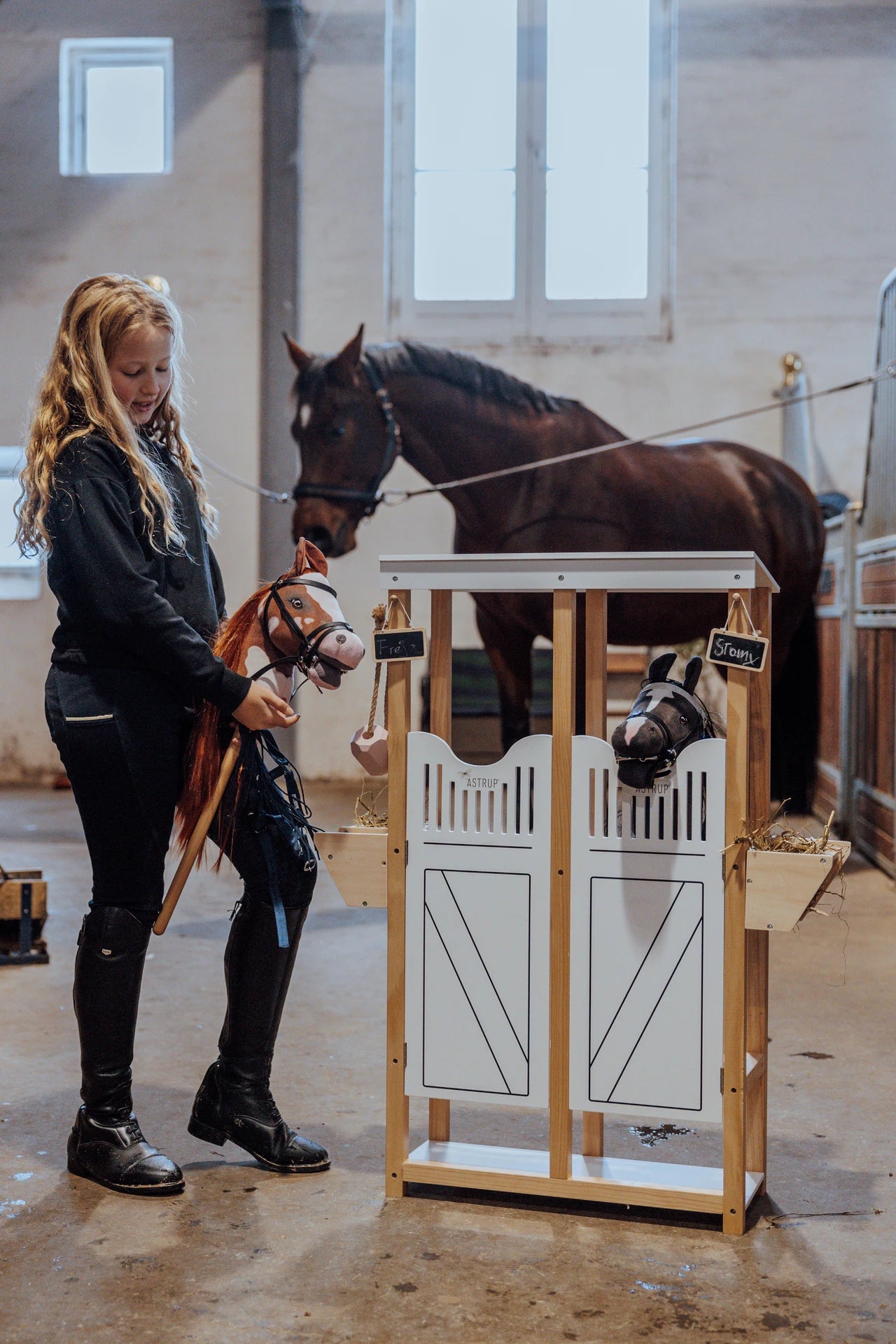 Elegant og detaljeret hestestald i nordisk design, skabt til opbevaring og leg med kæpheste og tilbehør.