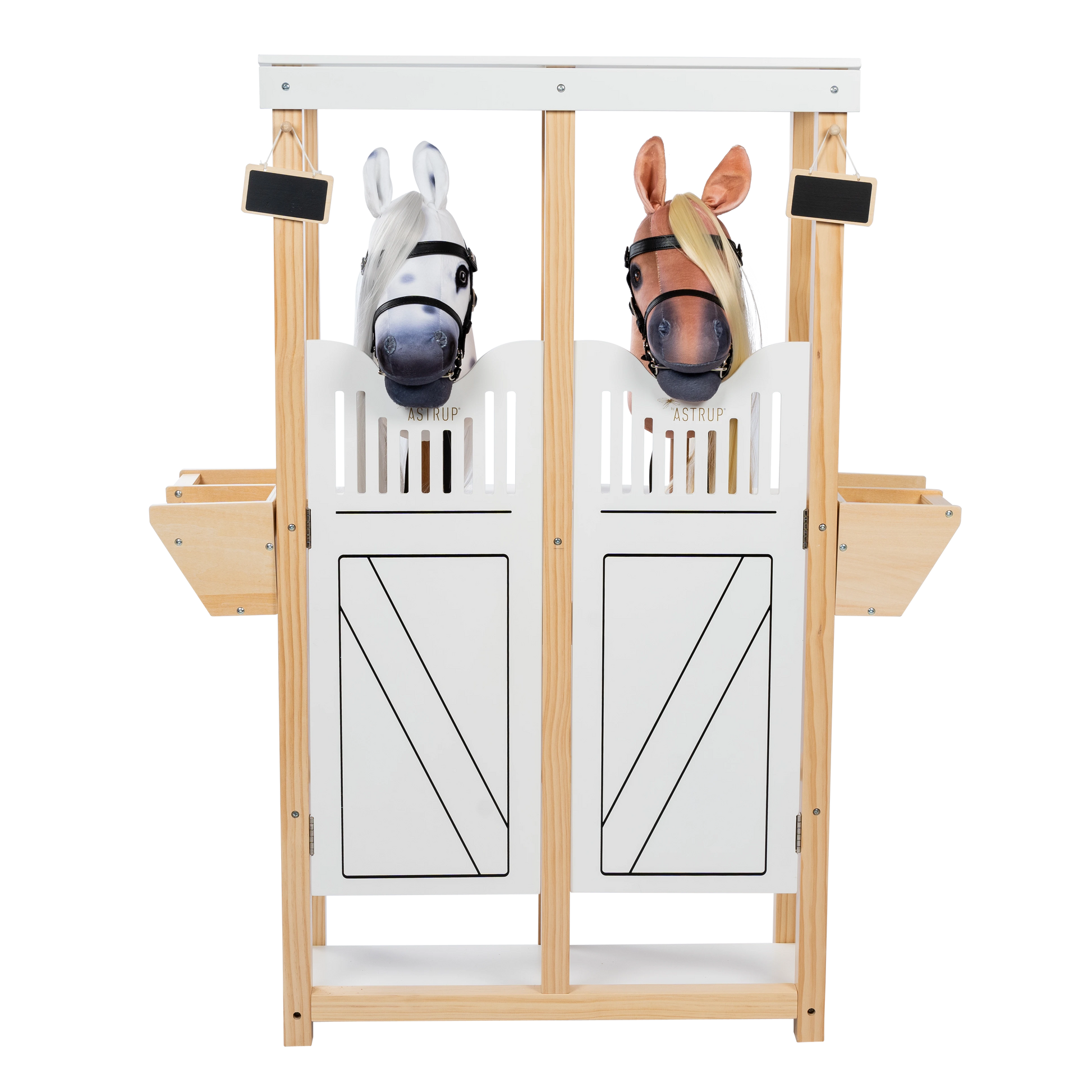 Hestestald til 2 kæpheste fra byASTRUP er et stort hit blandt børn, der elsker kæpheste, rolleleg og alt tilbehør, der hører hesteverdenen til. Denne smukke stald er skabt i et moderne, nordisk look med flotte detaljer og masser af plads til både kæpheste og udstyr. Designet passer perfekt til kæpheste med en pindlængde på ca. 40 cm og giver dem et fast og flot sted at "bo", hvile og blive opbevaret efter leg eller en fantasifuld konkurrence.