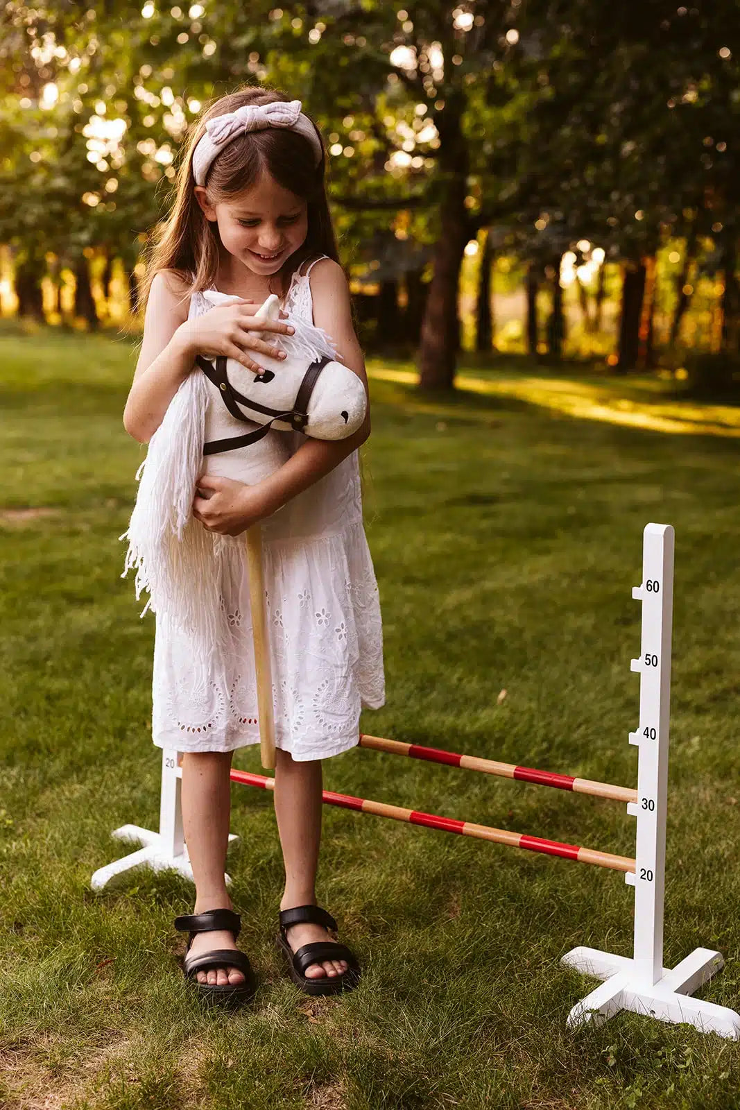 Dette spring er inspireret af ægte ridebanespring og giver børn mulighed for at udfordre sig selv og deres kæpheste i sjove springbaner. Stængerne kan justeres i højden fra 20 til 60 cm, så både begyndere og øvede kan være med. Det giver timevis af underholdning og træner samtidig børns balance, koordination og motorik.
