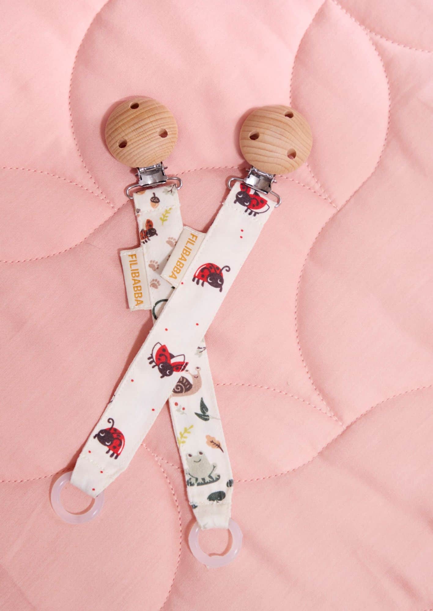 Sutteholderen har en fin træknap med metalclips, som fastgøres på barnets tøj og dermed sørger for, at sutten altid er i nærheden, og ikke falder på jorden. I den anden ende fastgøres sutten nemt med en velcrolukning.