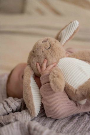 Blød, tryg og hjertevarm bamse med indbygget lydmodul, der afspiller beroligende hjertelyde og melodier. USB-genopladelig, timerfunktion og perfekt til at hjælpe baby med at falde til ro.