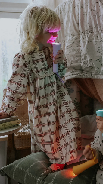 En børnevenlig, let og genopladelig LED-lommelygte lavet af genbrugsplast. Perfekt til både inde- og udendørs leg, camping, hygge under dynen og tryghed i mørket.