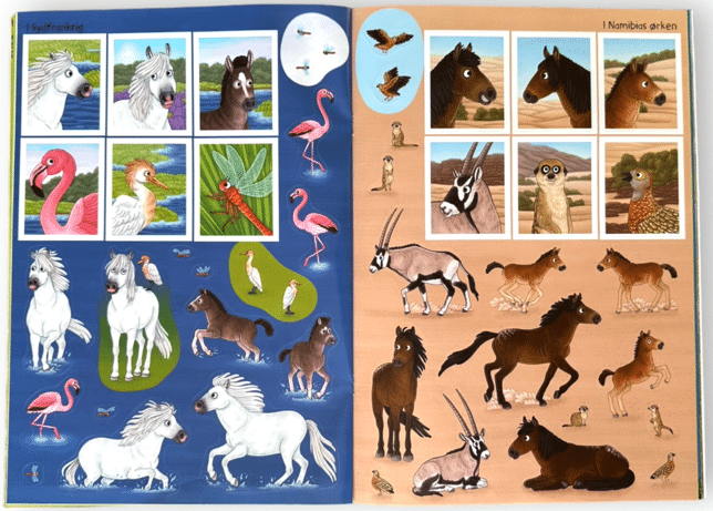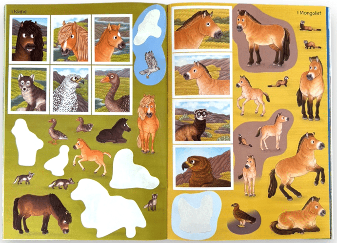Indsæt over 140 klistermærker på de 8 flotte landskaber og 44 dyrekort – og lær alt om heste, ponyer og andre dyr!