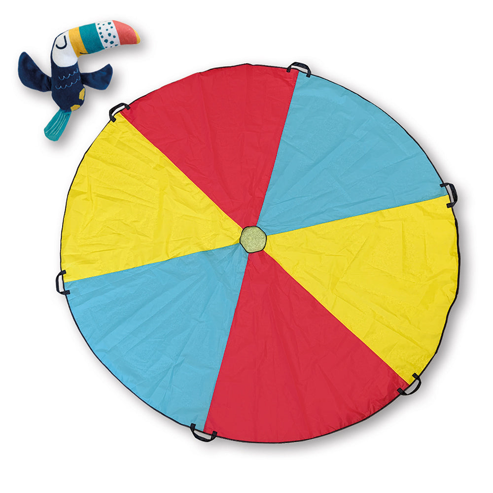 Se hvor højt tukanen flyver! Mød vennerne, og brug denne farverige legetøjsfaldskærm for at se, hvor højt du kan få tukanen til at flyve gennem luften.