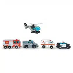 Indhold: Helikopter med roterende vinger, ambulance, brandbil, politibil og indsatsvogn.